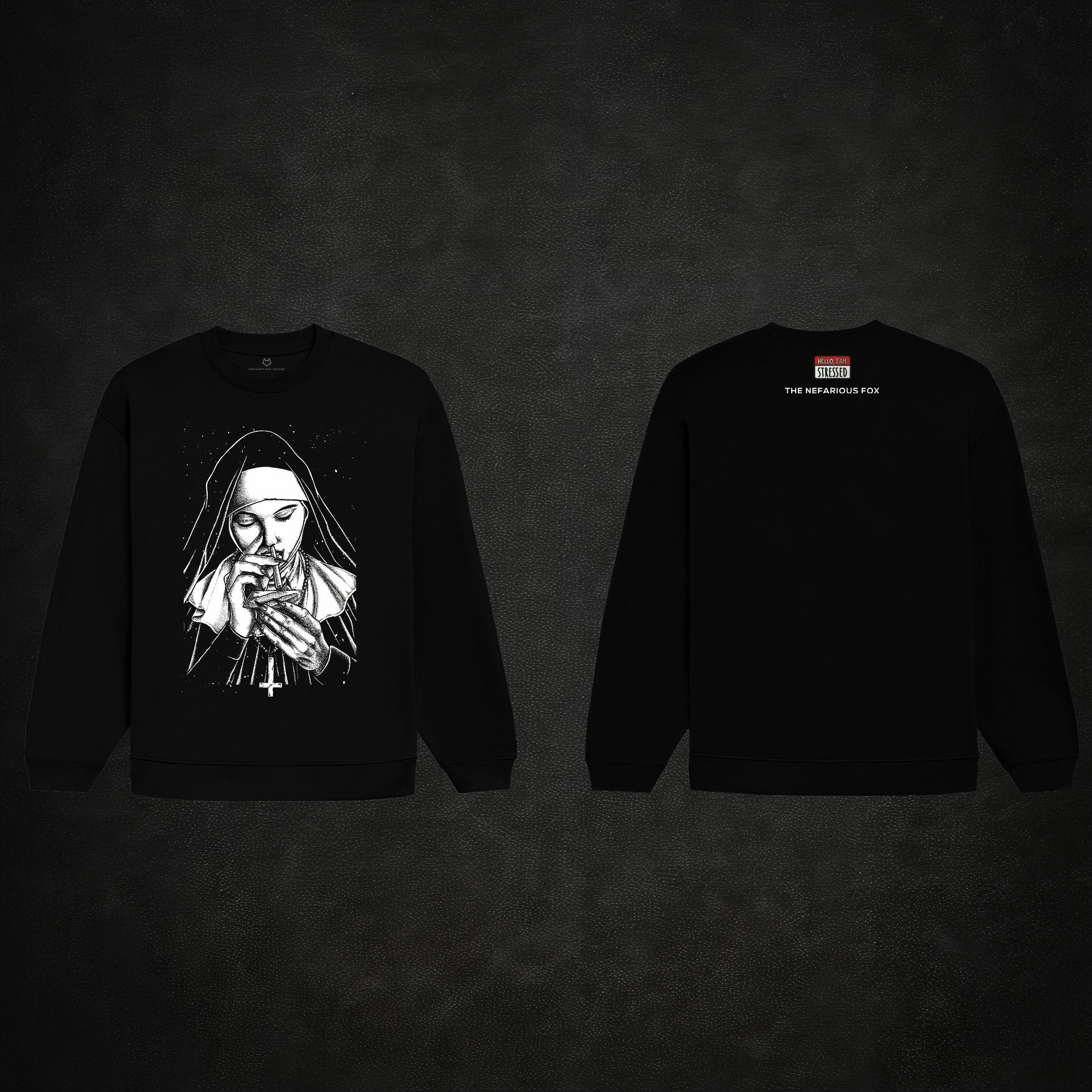 Minimal branding on the back keeps it clean with a patch saying "Hello! I am Stressed", while the front graphic does all the talking.