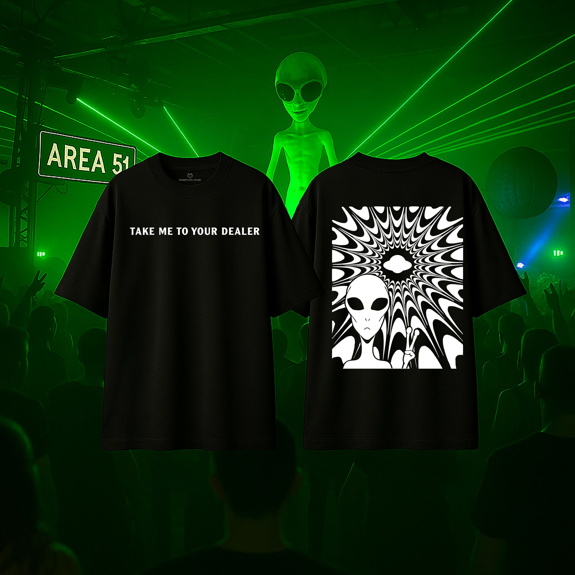 Drift into the unknown with Echoes From Nowhere, a bold oversized tee that’s equal parts cosmic and rebellious. The front declares "404: HUMANITY NOT FOUND" or "TAKE ME TO YOUR DEALER" in high-visibility reflective print — a glitch in the matrix you wear with pride. On the back, a tripped-out alien stares from a vortex of static, flashing the peace sign under the glow.
