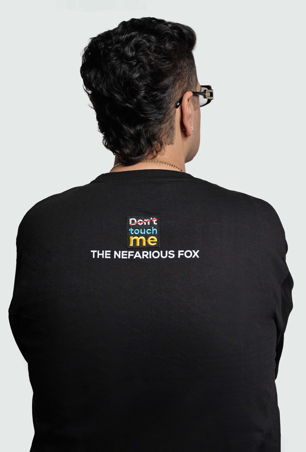 On the back, the design is completed with a “Don’t Touch Me” embroidered patch — a sharp, attitude-driven detail that adds contrast to the romantic chaos on the front. Subtle yet premium, the embroidery brings texture and exclusivity, reinforcing the piece’s confident, untouchable energy.