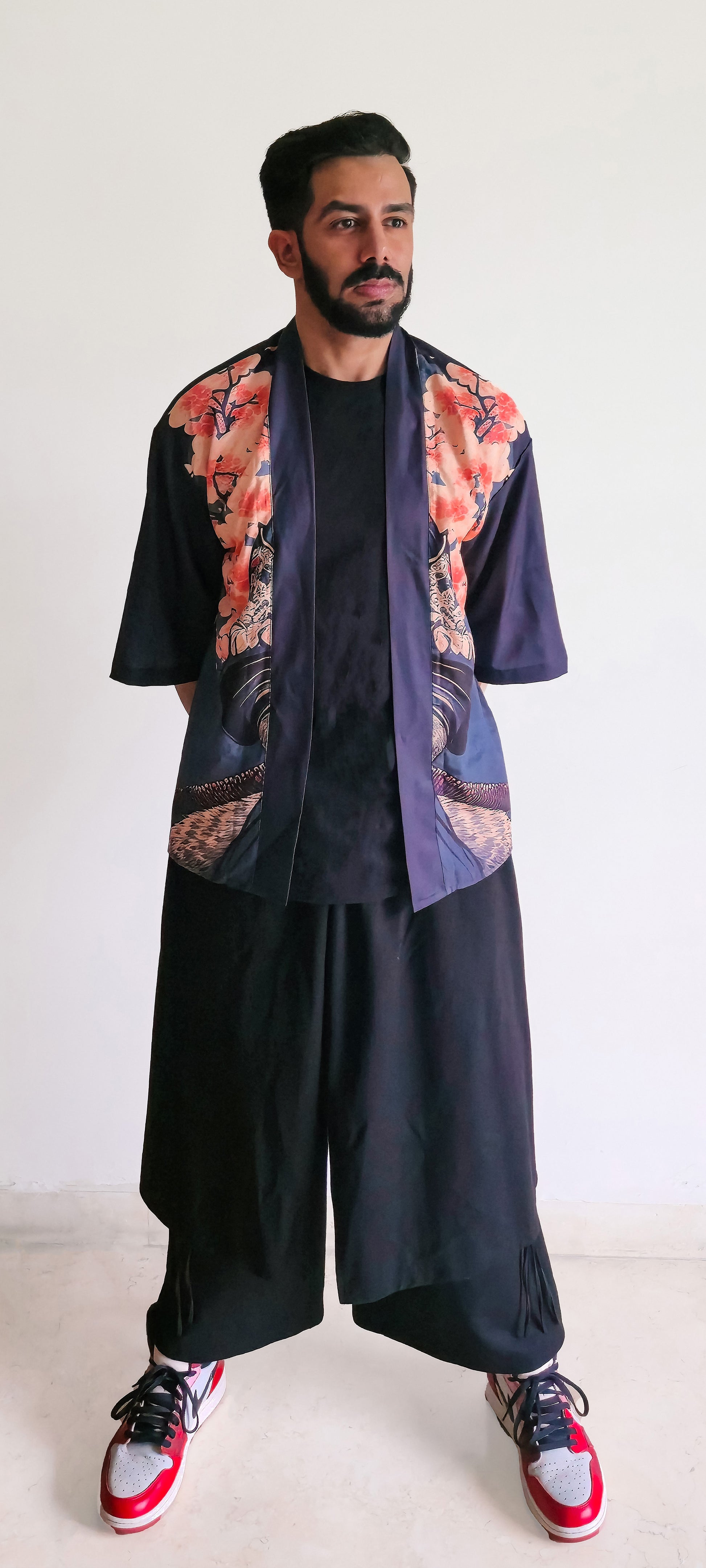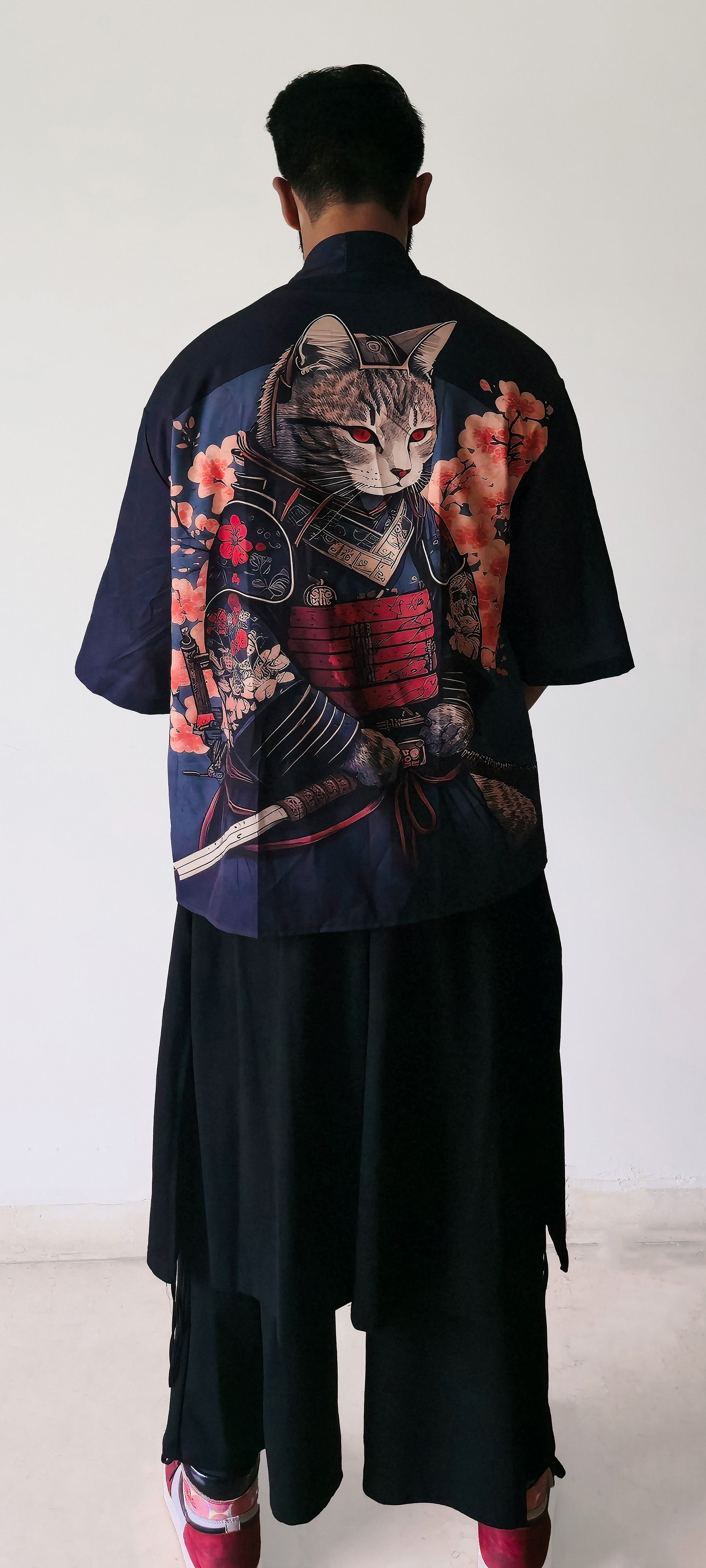 The Samurai Neko Kimono is a fusion of warrior spirit and feline grace, featuring an armored samurai cat standing with unwavering confidence amid blooming cherry blossoms. The intricate artwork, set against a deep bluish-black fabric, embodies the elegance and discipline of the samurai, with every detail—from the katana to the ornate armor—crafted to exude power and precision. Made from premium lightweight polyester, this kimono drapes effortlessly with a relaxed, open-front silhouette and wide sleeves, offering both comfort and style. The high-quality sublimation print ensures lasting vibrancy, making this a bold yet sophisticated statement piece. Whether you're drawn to its warrior essence or its artistic allure, the Samurai Neko Kimono is designed for those who embrace both strength and serenity. Honor the code. Unleash the feline warrior within.
